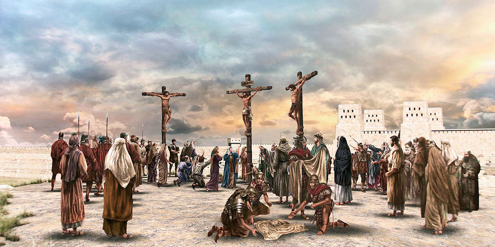C. Cuando llegaron al lugar llamado «del Cráneo», lo crucificaron junto con los malhechores, uno a su derecha y el otro a su izquierda. Jesús decía: