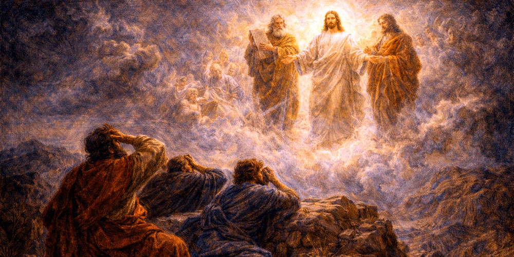 Jesús tomó a Pedro, a Santiago y a su hermano Juan, y los llevó aparte a un monte elevado. Allí se transfiguró en presencia de ellos: su rostro resplandecía como el sol y sus vestiduras se volvieron blancas como la luz. De pronto se les aparecieron Moisés y Elías, hablando con Jesús.