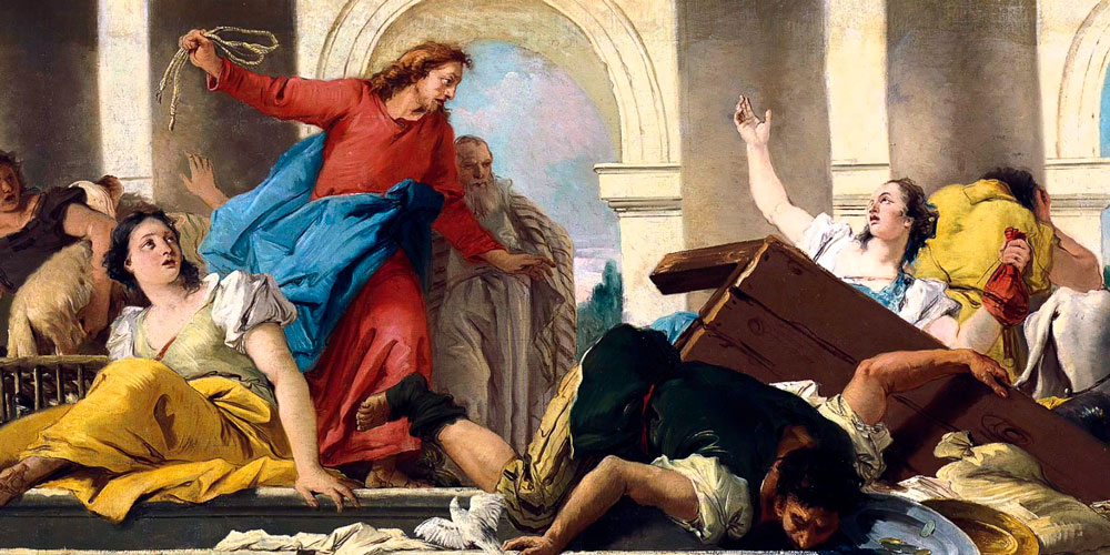 Se acercaba la Pascua de los judíos. Jesús subió a Jerusalén y encontró en el Templo a los vendedores de bueyes, ovejas y palomas y a los cambistas sentados delante de sus mesas. Hizo un látigo de cuerdas y los echó a todos del Templo, junto con sus ovejas y sus bueyes; desparramó las monedas de los cambistas, derribó sus mesas y dijo a los vendedores de palomas: «Saquen esto de aquí y no hagan de la casa de mi Padre una casa de comercio.»