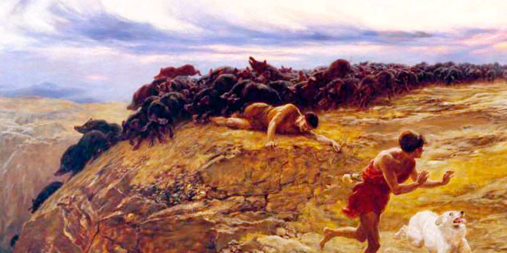A cierta distancia había una gran piara de cerdos paciendo. Los demonios suplicaron a Jesús: «Si vas a expulsarnos, envíanos a esa piara.» Él les dijo: «Vayan.» Ellos salieron y entraron en los cerdos: estos se precipitaron al mar desde lo alto del acantilado, y se ahogaron.