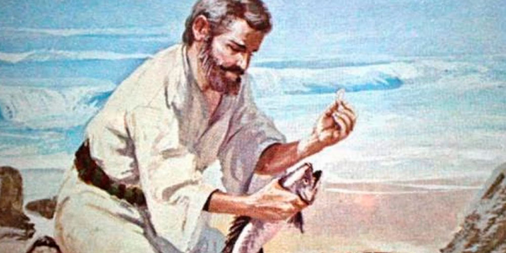 Cuando Pedro llegó a la casa, Jesús se adelantó a preguntarle: «¿Qué te parece, Simón? ¿De quiénes perciben los impuestos y las tasas los reyes de la tierra, de sus hijos o de los extraños?». Y como Pedro respondió: «De los extraños», Jesús le dijo: «Eso quiere decir que los hijos están exentos. Sin embargo, para no escandalizar a esta gente, ve al lago, echa el anzuelo, toma el primer pez que salga y ábrele la boca. Encontrarás en ella una moneda de plata: tómala, y paga por mí y por ti».
