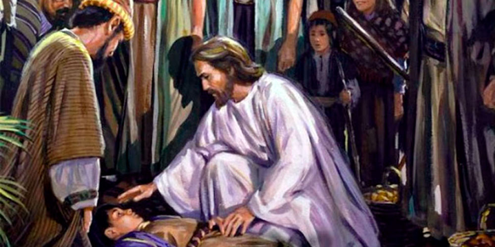Un hombre se acercó a Jesús y, cayendo de rodillas, le dijo: «Señor, ten piedad de mi hijo, que es epiléptico y está muy mal: frecuentemente cae en el fuego y también en el agua. Yo lo llevé a tus discípulos, pero no lo pudieron sanar.»