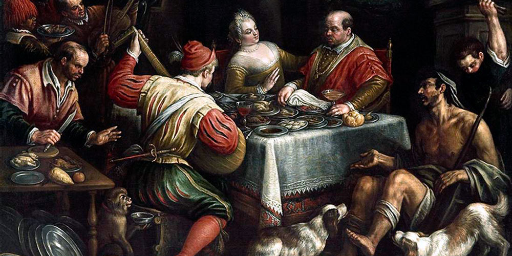 Había un hombre rico que se vestía de púrpura y lino finísimo y cada día hacía espléndidos banquetes. A su puerta, cubierto de llagas, yacía un pobre llamado Lázaro, que ansiaba saciarse con lo que caía de la mesa del rico; y hasta los perros iban a lamer sus llagas.