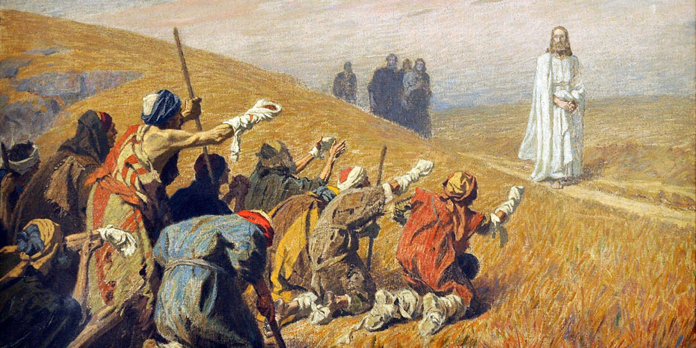 Mientras se dirigía a Jerusalén, Jesús pasaba a través de Samaría y Galilea. Al entrar en un poblado, le salieron al encuentro diez leprosos, que se detuvieron a distancia y empezaron a gritarle: «¡Jesús, Maestro, ten compasión de nosotros!»