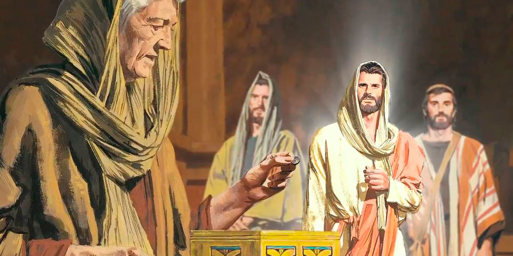 Levantando los ojos, Jesús vio a unos ricos que ponían sus ofrendas en el tesoro del Templo. Vio también a una viuda de condición muy humilde, que ponía dos pequeñas monedas de cobre, y dijo: «Les aseguro que esta pobre viuda ha dado más que nadie. Porque todos los demás dieron como ofrenda algo de lo que les sobraba, pero ella, de su indigencia, dio todo lo que tenía para vivir.»
