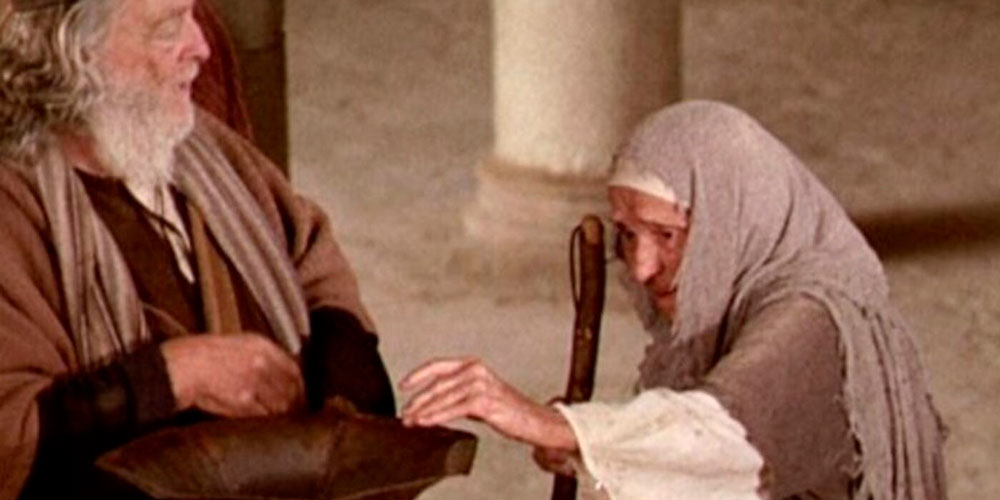 Levantando los ojos, Jesús vio a unos ricos que ponían sus ofrendas en el tesoro del Templo. Vio también a una viuda de condición muy humilde, que ponía dos pequeñas monedas de cobre, y dijo: «Les aseguro que esta pobre viuda ha dado más que nadie. Porque todos los demás dieron como ofrenda algo de lo que les sobraba, pero ella, de su indigencia, dio todo lo que tenía para vivir.»